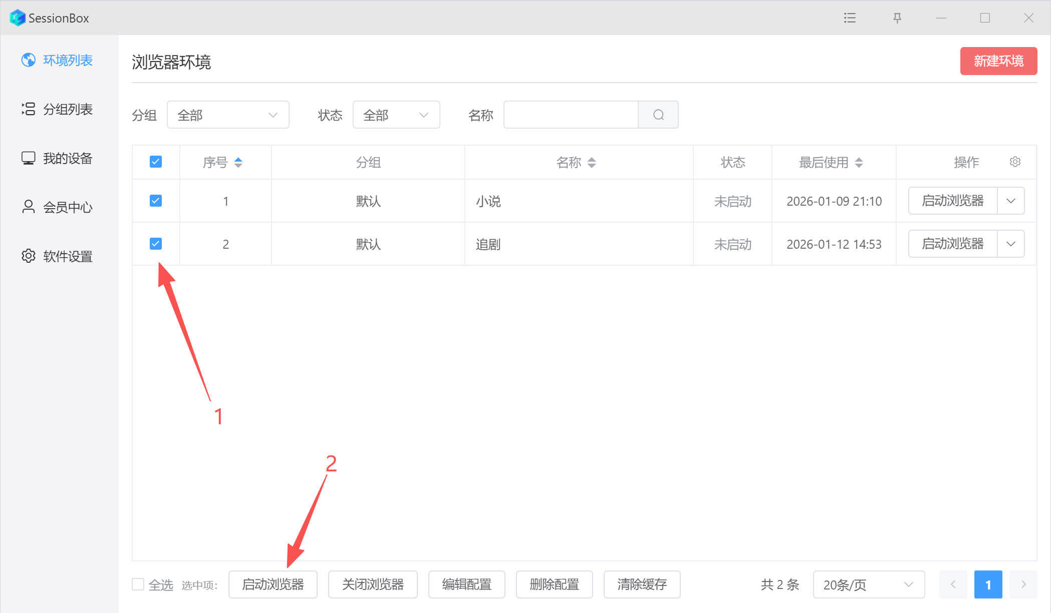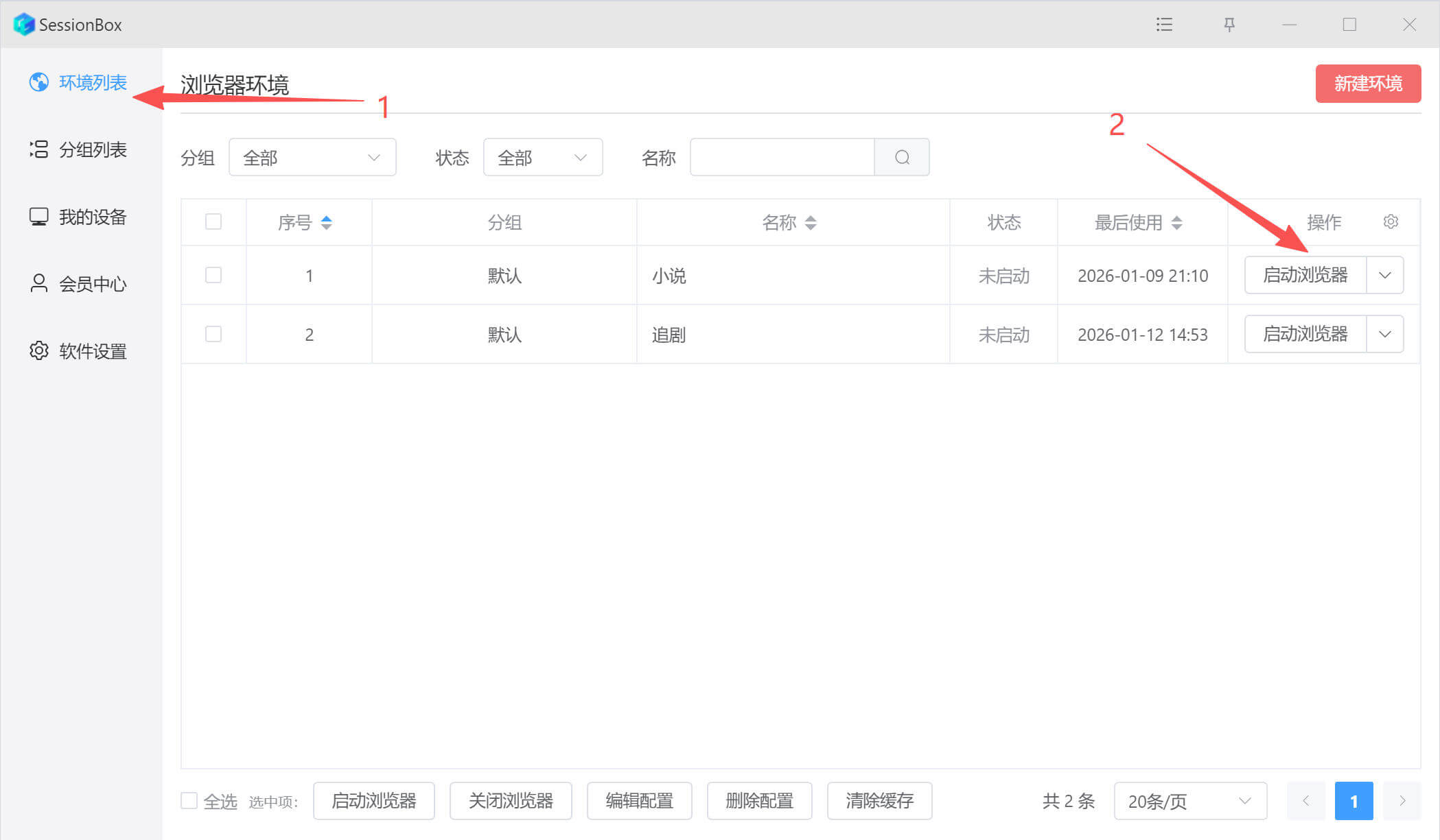 在浏览器环境列表页,找到要启动的浏览器配置,点击“启动浏览器”按钮,如下图:
